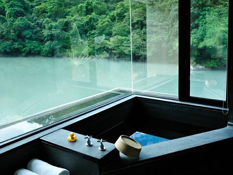 大きく広がる窓枠まで身を乗り出せば、屋外に広がる自然も間近です。そして室内の浴槽に浸かって絶好の視界を堪能してもいいでしょう。自然が奏でる抑揚がシンフォニーのよう。それに耳を傾ければ、温泉らしい雰囲気に包まれることでしょう。