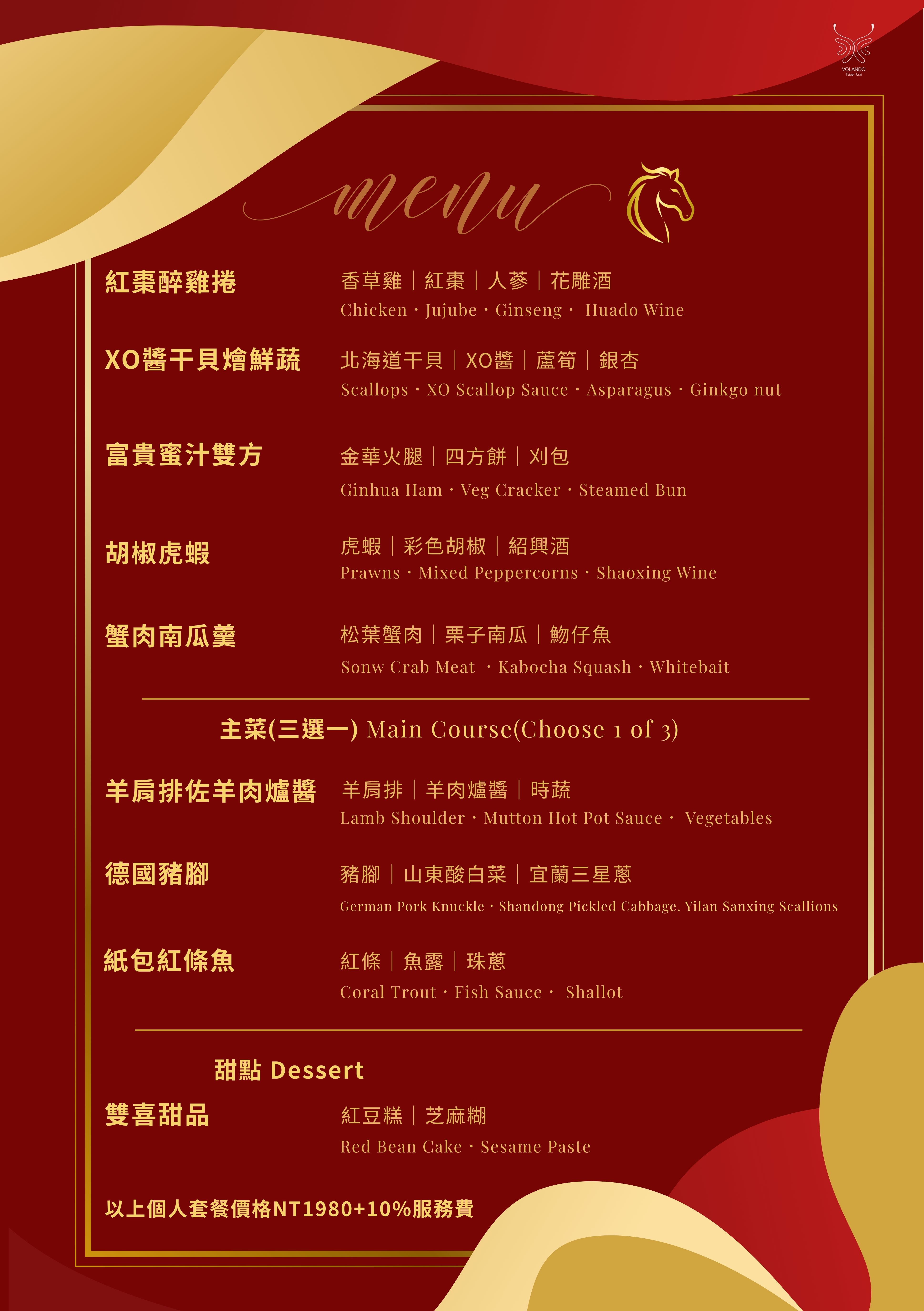蜜汁雙方象徵好事成雙,寓意富貴圓滿;紅棗醉雞卷,以紅棗入饌,補氣養身,象徵平安順遂;而XO 醬干貝燴鮮蔬,干貝象徵富貴昌隆,寓意一整年皆豐收;蟹肉南瓜羹,以金黃南瓜象徵富足安定,為團圓餐桌收攏溫柔與圓滿。最後以紅豆糕與芝麻糊作結,紅豆象徵團圓圓滿,芝麻寓意開運納福,祝福新的一年甜蜜順心、馬年順利。
